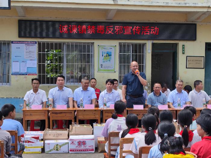 在大良小学,镇党委书记廖永满,与岑溪市教育局副局长李显平,岑溪市农商行党委书记、董事长周正杰,诚谏镇商会会长李荣等莅临现场参加活动,为师生提供精神与物质上的支持。在活动中,廖永满书记向学生们表达了诚谏镇党委的关爱,并鼓励学生们强健体魄,认真学习法律法规知识。同时,镇平安法治办、司法所工作人员向同学们派发民法典、反电诈、反邪教、“扫黄打非”、平安校园等宣传册,积极向学生普及相关知识。