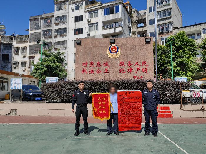 每一面锦旗的背后,都有一个温暖的故事,每一个故事都是警民鱼水情的体现。10月31日,岑溪市公安局特巡警大队收到一份来自市民群众送来的特殊“礼物”——一面印有“拾金不昧 品德高尚”字样的锦旗,以表示对岑溪市公安局特巡警大队队员热心帮助她找回遗失手机的感谢。
